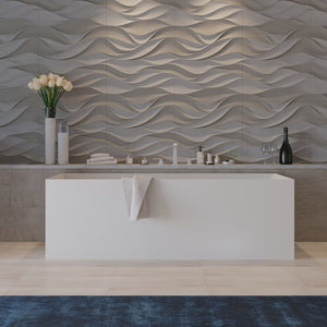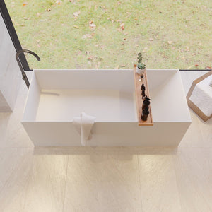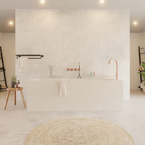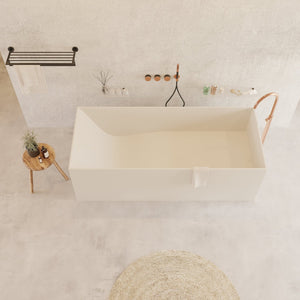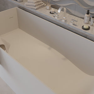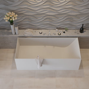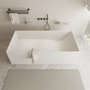 The Ideavit SolidStar 180 is a contemporary freestanding solid surface bathtub with a distinctive ergonomic wave interior. Its sculpted form creates a natural reclining position for comfort while maintaining clean rectangular lines on the outside. Crafted in durable, non-porous solid surface with a seamless matte finish, the SolidStar is hygienic, UV-resistant, and restorable if scratched. Available in two sizes, both models feature an integrated overflow, a matching pop-up drain, and adjustable feet for stable installation.