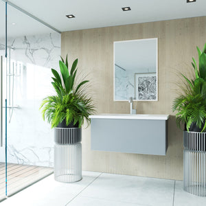 Handcrafted in Italy, the Vitri collection brings you a modern look with an elegant touch. This collection is engineered with the highest grade cabinet materials, push-to-open Blum hardware, and wrapped by beautifully frosted Nano Glass panels. LAVIVA's Nano Glass Technology makes the glass durable for everyday use and won't leave smudges or fingerprints behind. The Vitri collection's adaptive design allows you to combine multiple cabinets to create any size vanity to fit your space. When paired with LAVIVA's countertops, you can create any feel in your bathroom. The VIVA Stone Solid Surface countertops give it a sleek modern look. This premium vanity is a perfect fit for any bathroom and will become the centerpiece of your space.