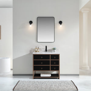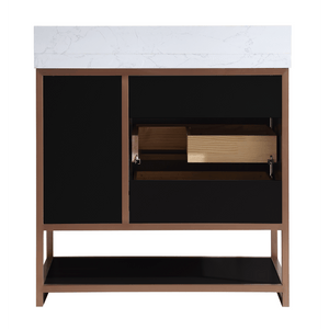 Legion Furniture 36" Vanity with Golden Brush Stainless Steel Frame and Tricorn Black Finish with 2" Thick White Natural Marble Countertop