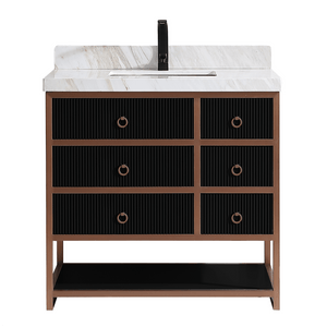 The Metal Collection combines modern elegance with durable craftsmanship, offering a perfect balance of style and function. These premium vanities feature solid oak wood frames for lasting stability, complemented by sleek stainless steel bases in a brushed golden finish. Each piece is available with either a thick natural marble countertop or an artificial stone top, allowing you to choose the best fit for your space. A white ceramic undermount sink provides a clean, sophisticated look. Soft-close drawers and flip-down compartments offer ample storage without sacrificing style. Designed for effortless installation, each vanity includes pre-drilled faucet holes tailored to its size. Whether upgrading a powder room or transforming a master bath, the Metal Collection brings sophistication and practicality to any space.