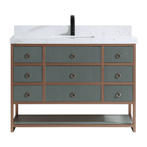 The Metal Collection combines modern elegance with durable craftsmanship, offering a perfect balance of style and function. These premium vanities feature solid oak wood frames for lasting stability, complemented by sleek stainless steel bases in a brushed golden finish. Each piece is available with either a thick natural marble countertop or an artificial stone top, allowing you to choose the best fit for your space. A white ceramic undermount sink provides a clean, sophisticated look. Soft-close drawers and flip-down compartments offer ample storage without sacrificing style. Designed for effortless installation, each vanity includes pre-drilled faucet holes tailored to its size. Whether upgrading a powder room or transforming a master bath, the Metal Collection brings sophistication and practicality to any space.