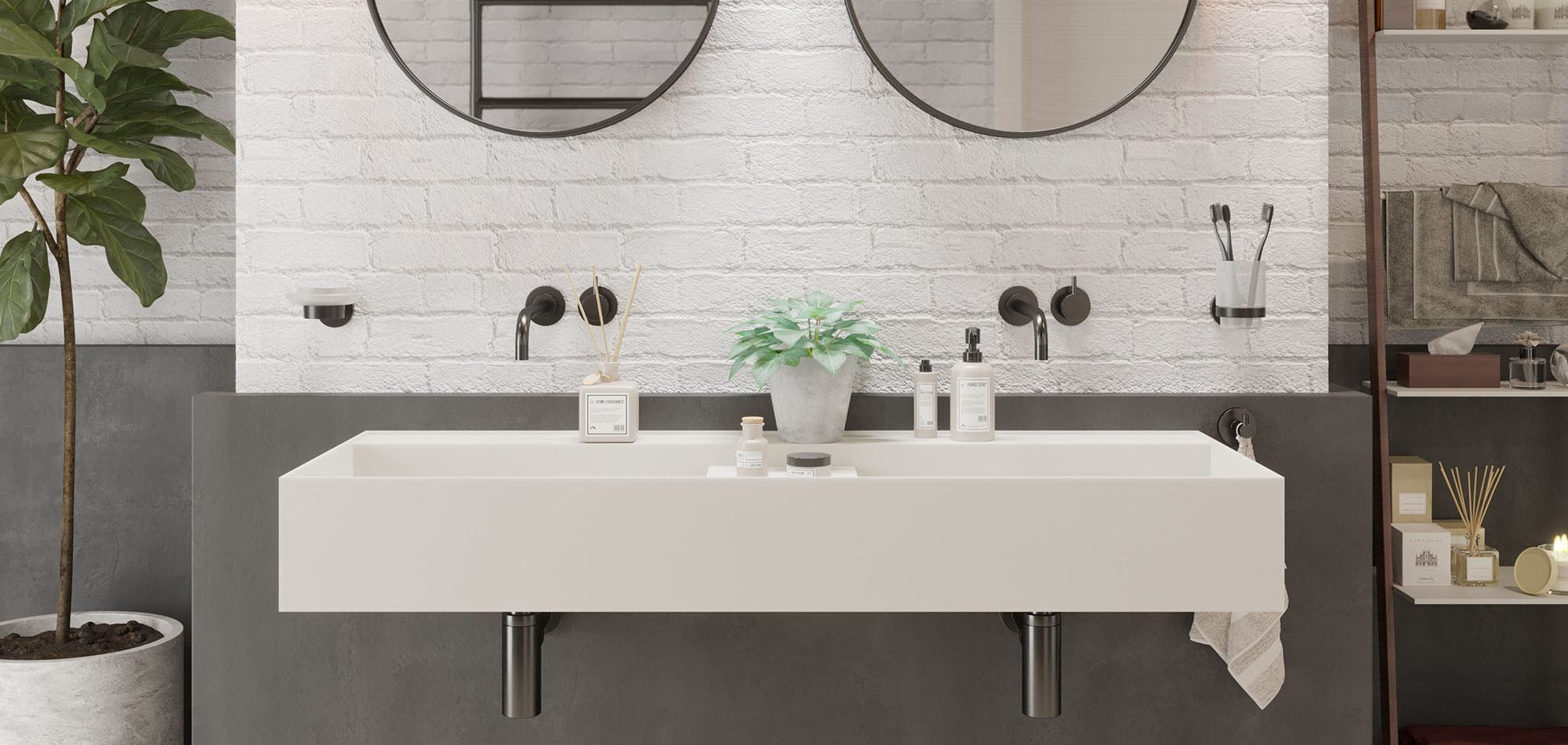 • Wall-mounted double-basin sink (washbasin) in matte solid surface