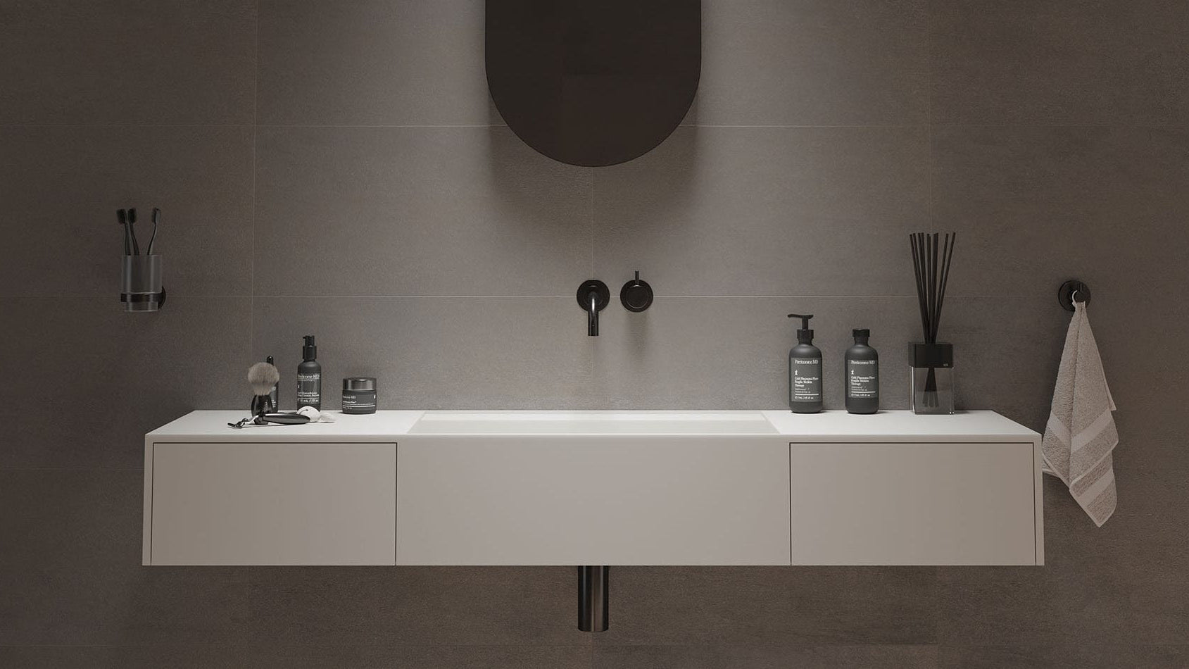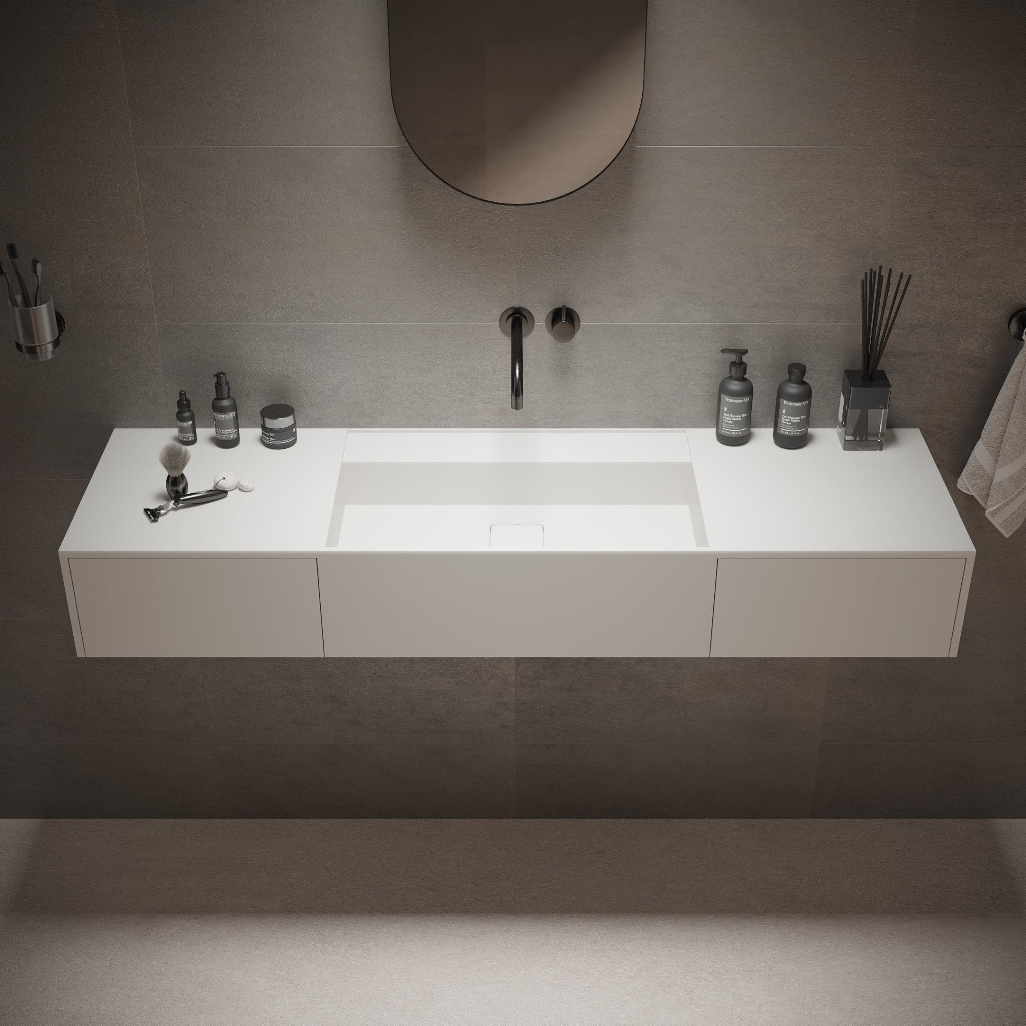• Wall-mounted sink (washbasin) in matte solid surface with integrated drawers