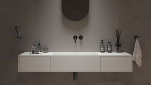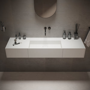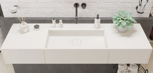 The Ideavit SolidBliss 140 DR combines minimalist precision with functional storage. Its seamless matte solid-surface construction features softly rounded interior corners and a concealed hidden-drain system, complemented by two full-extension drawers on Blum soft-close slides. The expansive 55" width provides generous workspace while preserving a sculptural, wall-hung silhouette. The solid deck can also be drilled for a single-hole faucet if desired.