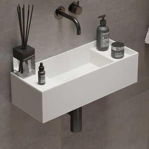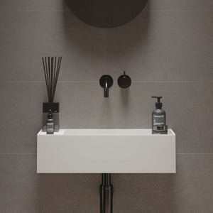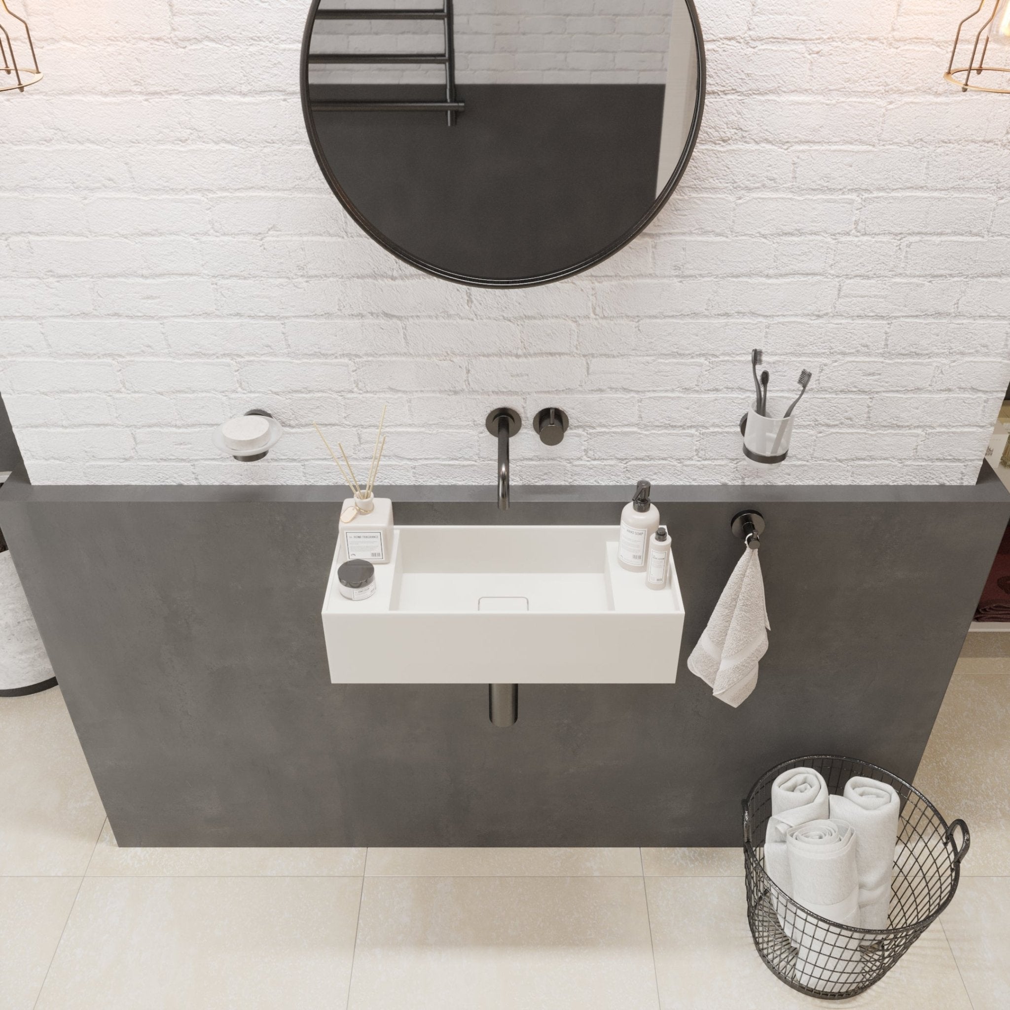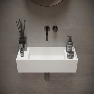 The Ideavit SolidBliss 55 balances minimalism and practicality through its slim geometry and reversible design. With thin edges, rounded interior corners, and two compact side decks that can be oriented left or right, it brings flexibility to tight spaces. The hidden drainage system keeps the surface clean and uninterrupted, complemented by a matching solid surface drain cover. The solid top surface can also be drilled for a single-hole faucet if desired.