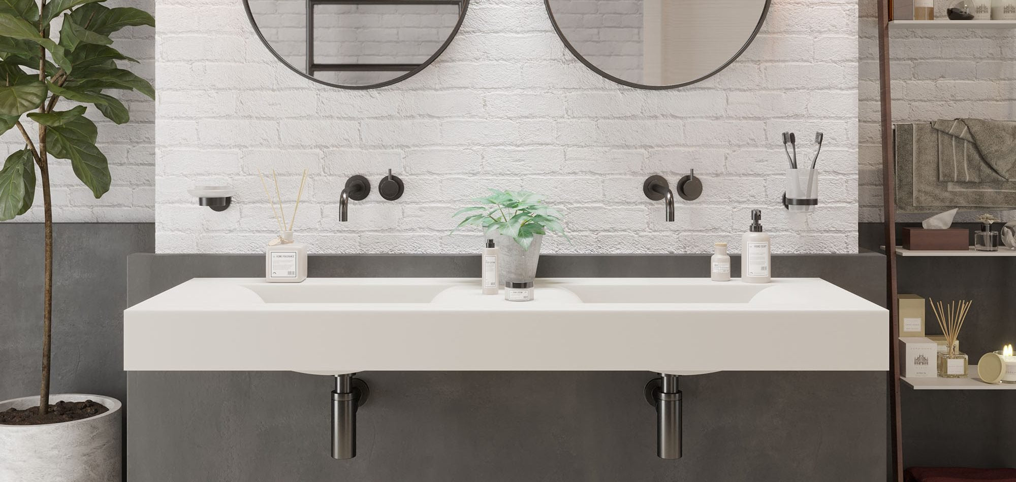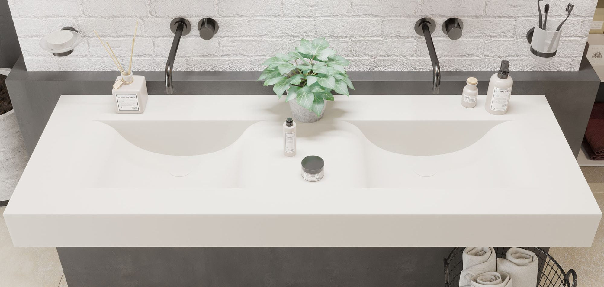 • Wall-mounted double-basin sink (washbasin) in matte solid surface