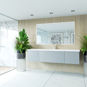 Handcrafted in Italy, the Vitri collection brings you a modern look with an elegant touch. This collection is engineered with the highest grade cabinet materials, push-to-open Blum hardware, and wrapped by beautifully frosted Nano Glass panels. LAVIVA's Nano Glass Technology makes the glass durable for everyday use and won't leave smudges or fingerprints behind. The Vitri collection's adaptive design allows you to combine multiple cabinets to create any size vanity to fit your space. When paired with LAVIVA's countertops, you can create any feel in your bathroom. The VIVA Stone Solid Surface countertops give it a sleek modern look. This premium vanity is a perfect fit for any bathroom and will become the centerpiece of your space.