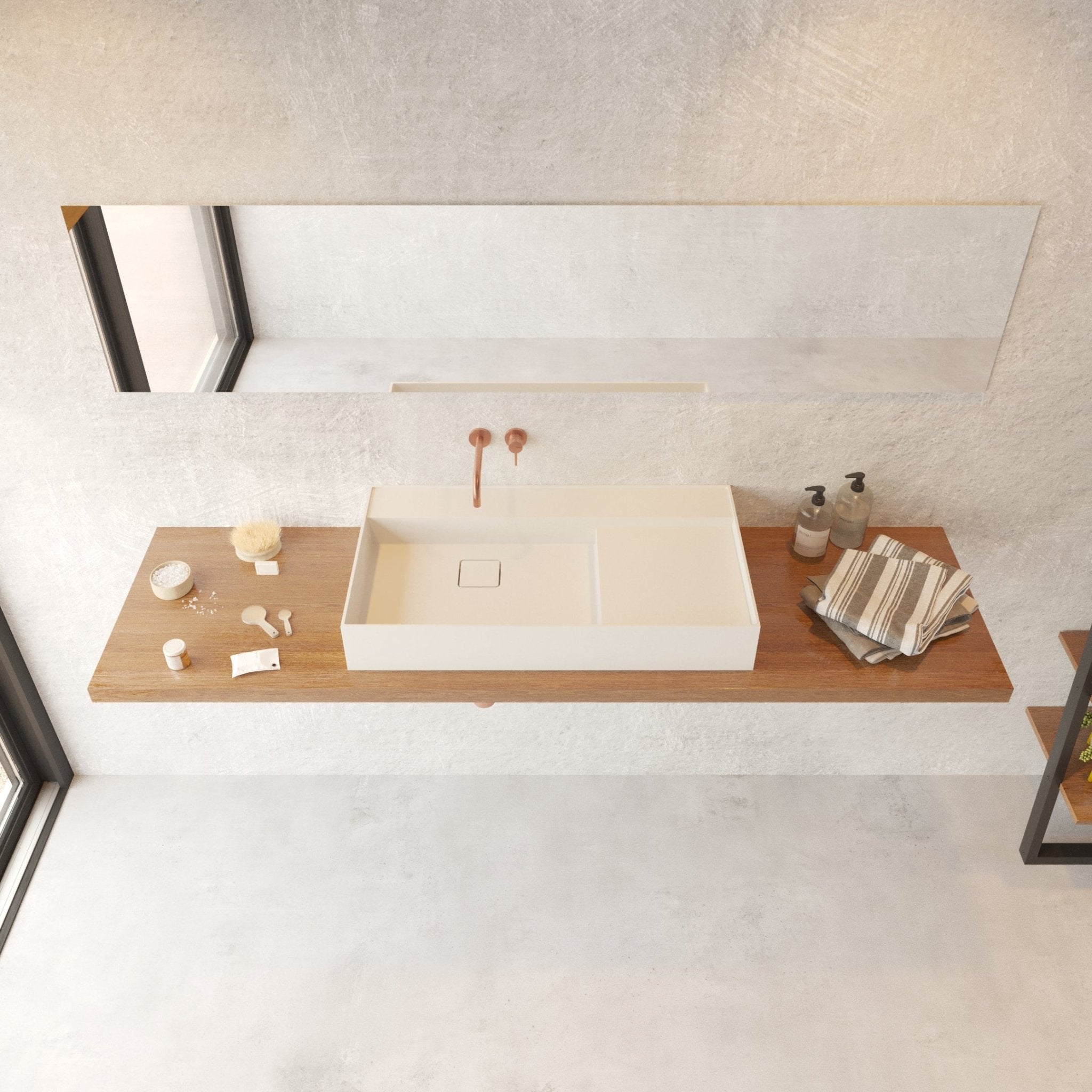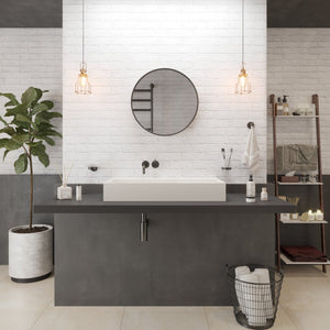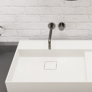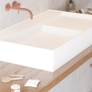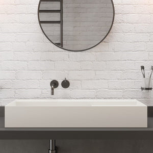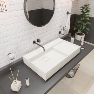 The Ideavit SolidBliss 80 is a wide 31-inch vessel sink featuring a clean geometric basin, a concealed hidden-drain layout, and a matching solid surface square drain cover. Its matte solid surface construction offers a smooth, velvety feel with excellent durability, while the extended width and integrated side deck provide a balanced, architectural presence ideal for modern vanities and contemporary bathroom layouts.