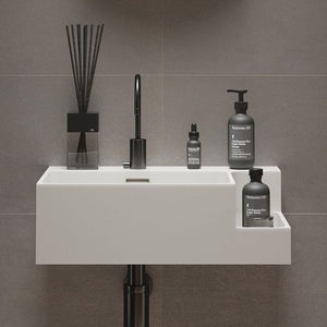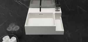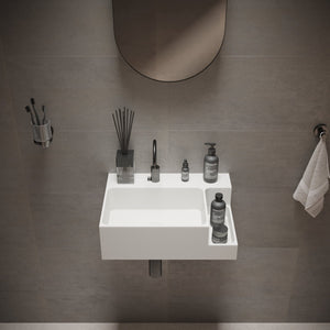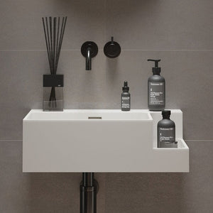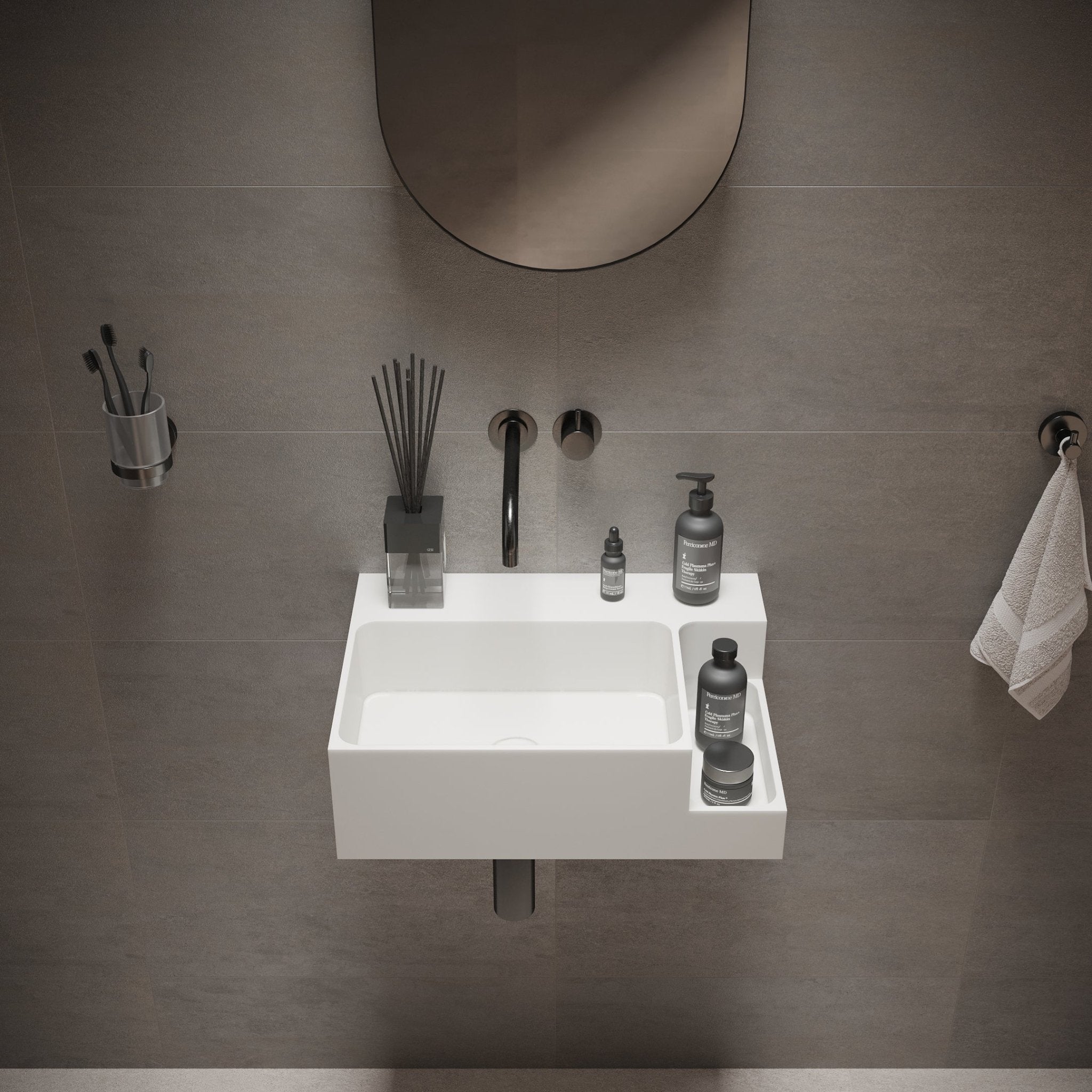The Ideavit SolidDual 1.0 is a minimalist wall-mounted sink designed with a compact footprint and functional details. A small integrated shelf on the right offers practical space for daily essentials, while the built-in overflow and optional faucet hole make it a versatile solution for a range of bathroom layouts. Crafted from matte solid surface, it combines timeless design with everyday durability.